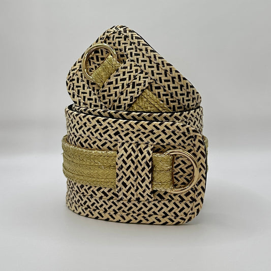 These natural fiber belts are a celebration of Colombian heritage, handcrafted by the Zenu tribe using caña flecha, a native plant fiber. Each belt is braided by hand, with every design carrying a unique meaning. Designed for versatility, they come with interchangeable sashes to adjust to your waist doing a knot or bow. These belts beautifully accentuate your waist.